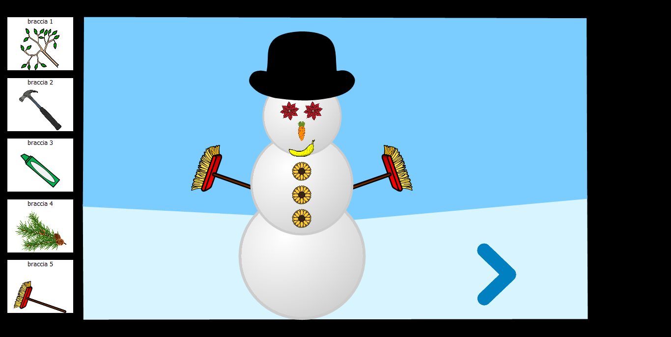 Atividade simples do tipo causa-efeito, na qual se constrói um boneco de neve selecionando partes do corpo e acessórios. A imagem final pode ser impressa e usada para decorar um cartão de felicitações para as festas natalinas.